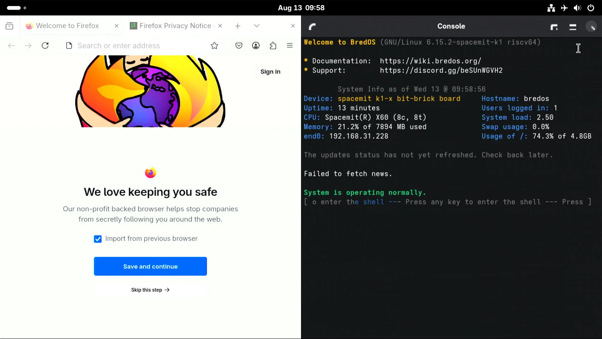 Welcome to BredOS (GNU/Linux 6.15.2-spacemit-k1 riscv64)