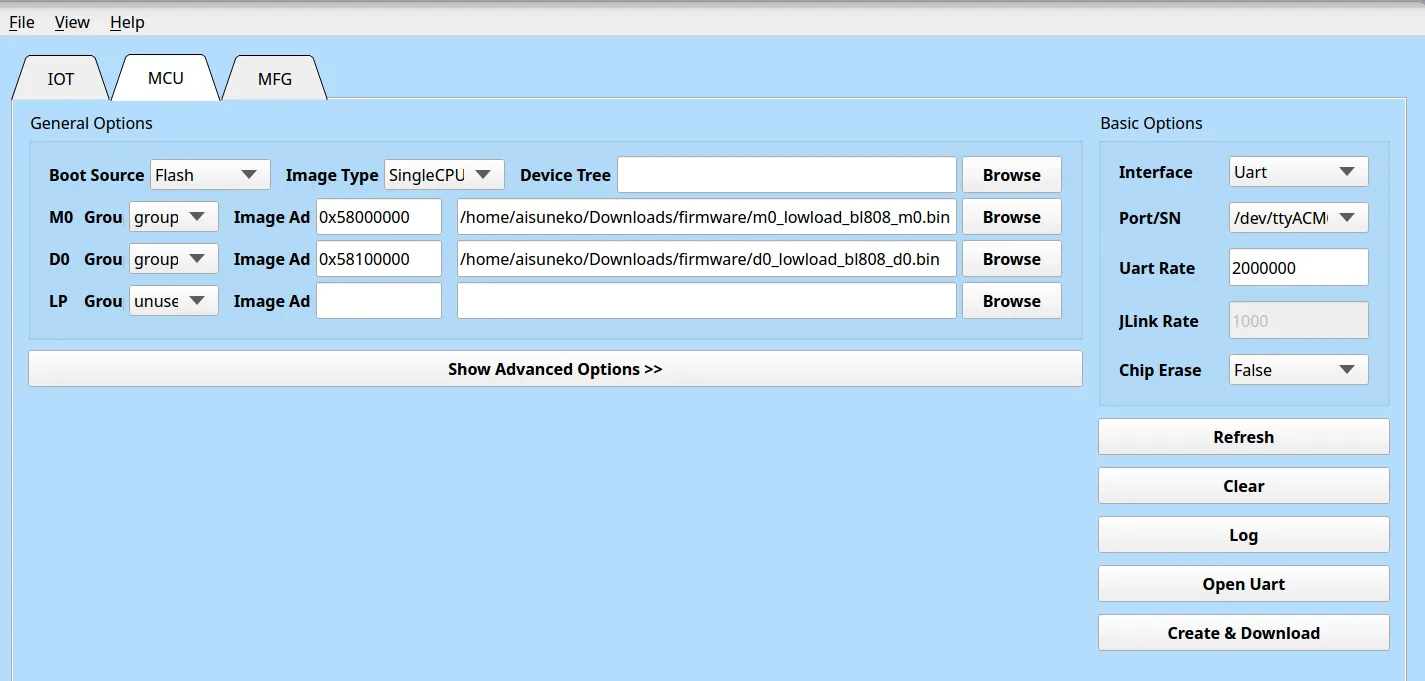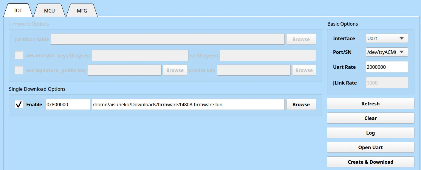Enable “Single Download”, set address to 0x800000 and choose bl808-firmware.bin from the above archive.